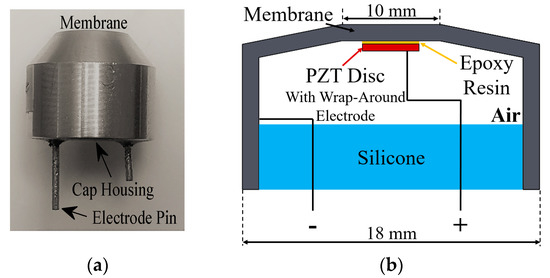 (a) The commercial aluminium-body FUT, showing the metal cap housing containing a piezoelectric ceramic disc bonded to the underside of the membrane, and (b) a side-view schematic displaying the composition of a typical FUT, where the rear of the FUT contains an air cavity with a backing layer for damping.