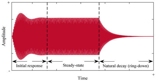 The three response regions of a FUT under forced excitation. Note that in this case the FUT is being driven at a frequency a few percent higher than its natural mechanical resonance frequency, leading to the oscillation in amplitude and larger amplitude vibration in the initial response than in the steady state.