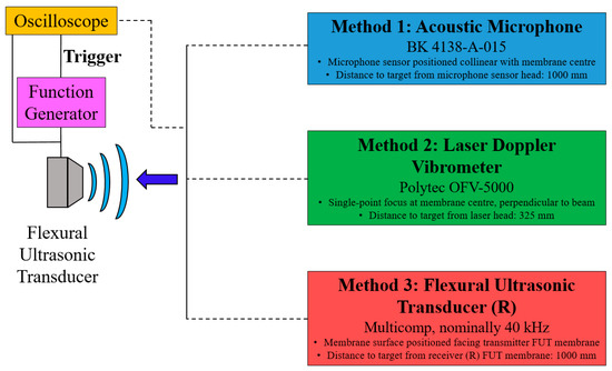The analysis of FUT vibration response is conducted by comparing three experimental techniques. The first is using an acoustic microphone (BK 4138-A-015, Brüel & Kjær Sound & Vibration Measurement A/S, Nærum, Denmark), the second through laser Doppler vibrometry (LDV, Polytec OFV-5000, Waldbronn, Germany), and the third by using a second FUT as a receiver. The differences in measured vibration response between these techniques is important for the design and operation of FUT systems, particularly in relation to how FUTs are operated. The FUT transducers used here were manufactured by Multicomp, while a number of other FUT manufacturers produce transducers with almost identical designs and characteristics.