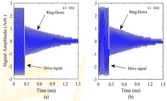 To demonstrate the measurement of the resonance frequency of the FUT using only the function generator and oscilloscope, the Fast Fourier Transform (FFT) of the amplitude-time response was computed, from measurements recorded with drive frequencies of 40 kHz and 41 kHz, both being close to the nominal resonance frequency of the FUT. A burst sine signal with 10 cycles at 10 VP-P (peak to peak voltage) was applied to the FUT, and the electrical response signal from the function generator measured using the oscilloscope. The characteristic form of these electrical signals are shown in Figure 4 for both drive frequencies, and clearly indicate the drive and ring-down regions. It should be noted that the y-axis values in Figure 4 are arbitrary in order for the ring-down region to be clearly displayed.