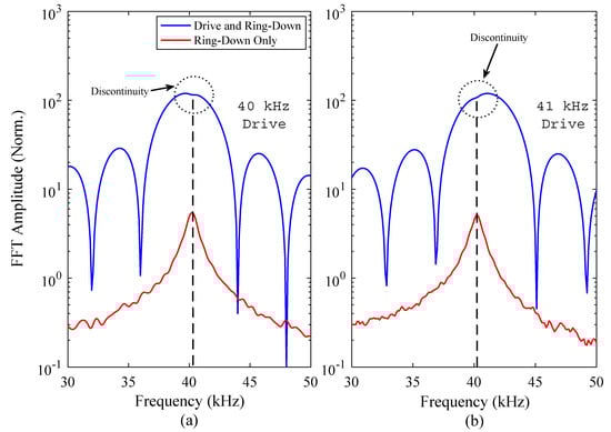 FFT results of FUT response at resonance for a 10 VP-P burst sine signal of 10 cycles, showing the measurement of the resonance frequency, where the ring-down curve is superimposed, for drive frequencies of (a) 40 kHz, and (b) 41 kHz. There is a very small discontinuity, or kink, in the FFT result of each entire electrical signal of Figure 4, corresponding to the resonance frequency of the (0,0) mode of vibration of the FUT.