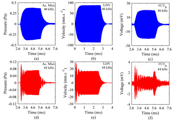 FUT response for drive frequencies of 40 kHz and 44 kHz using different measurement methods. Results for 40 kHz using (a) an acoustic microphone, (b) LDV, and (c) the FUTR are demonstrated, followed respectively by those for 44 kHz in (d–f). The LDV results are presented from time = 0 ms to demonstrate the immediate measurement of the FUT vibration response. Note the scale changes between the graphs.