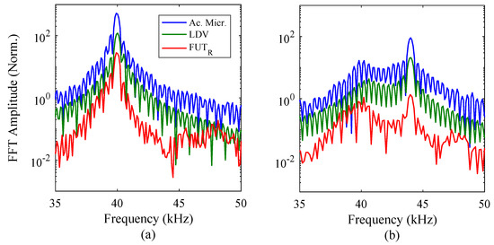 For a drive frequency of 40 kHz, as shown in Figure 7a, the measured frequency response from the three techniques correlate closely. The amplitudes of each data set have not been adjusted, to give an indication of the relative magnitudes of the FFTs in each case. The peaks in the amplitude-frequency spectrum for each measurement technique provide information regarding the drive signal frequency and the resonance frequency of the FUT. In the results shown in Figure 7a, it has been shown that the drive signal frequency and the resonance frequency of the FUT are close, and each measurement result is consistent with those of the other methods. The analysis of the 44 kHz drive signal shows a similar level of correlation. The energy in the amplitude-frequency spectrum is shared between the natural resonance around 40 kHz, and the drive signal frequency at 44 kHz.