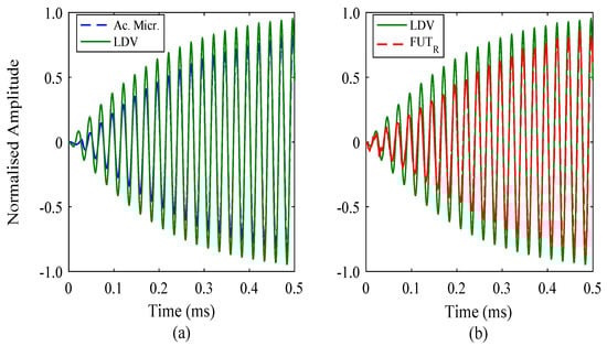 Initial region amplitude-time responses for the three measurement techniques, for a 40 kHz burst sine drive signal excitation of 110 cycles, showing the comparison between data from (a) the acoustic microphone and LDV, and (b) the LDV and FUTR. Note that the signals have been time shifted relative to each other to aid comparison of the profiles of the measured responses.