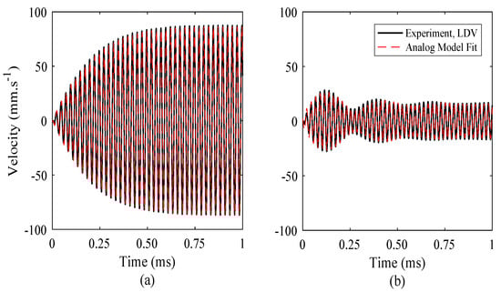 FUT vibration response in the initial region determined from the analog model compared with experimentally obtained LDV data, for drive frequencies of (a) 40 kHz and (b) 44 kHz. The experimental data and the fit of the mechanical analog model produced from (31) almost completely overlap in each case.
