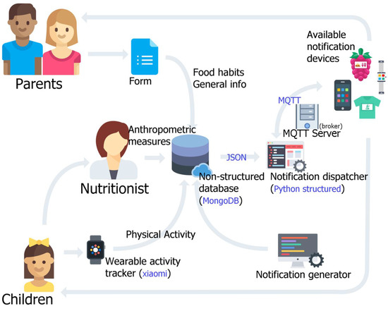 Our system is comprised of six main technological components. The first component, the physical activity tracker, is a device that family members use to gather their physical activity data and store it in the database. Activity bracelets attached to the wrist of children during the week provide information about steps, activity time, distance, calories burned, and quality of sleep among other features. Analysis of these data is later used to determine, for example, proper times of notification in conjunction with general information, food habits and anthropometric measurements that are manually collected. Recognition of parameters from activity bracelets can be performed in an automated and transparent. However, since we are using Xiaomi 1S (Xiaomi Inc., Haidian District, Beijing, China) smart wristband this process is semi-automated (i.e., data are synchronized with a smartphone via Bluetooth connection and requires a manual script).