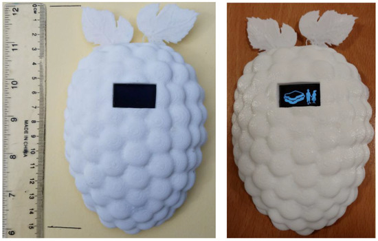 Both prototypes have been specifically designed to deliver notifications that promote healthy behaviors in children. The most complex consists of a fridge magnet that includes a 0.96-inch monochrome OLED graphic display, which has been connected through the SPI bus to the micro-controller. It has 128 × 64 pixels that can be used to display static or dynamic monochromatic images and text messages. Furthermore, this prototype is equipped with a single InvenSense MPU-6050 6-DOF IMU (InvenSense Inc., San Jose, CA, USA) wired through the I2C interface. It has been included to support feedback actions in notifications, such as “opened/closed fridge door alarm”, among others. This prototype is focused on delivering notifications that promote healthy eating behaviors through the fridge door, as it is a right place to do it. This decision is since kitchen surfaces, particularly fridge doors, are frequently used as reminder systems at home-specific locations [23]. Shopping lists, to-do lists, tailored messages, and paper reminders are often left on the fridge. In this context, emphasis is placed on the importance of fridge magnets as they are seen to contribute to a fluidity and configurability that make fridge surfaces unique to provide contextual cues to the users [24]. Therefore, fridge doors are appropriate places to deliver proactively notifications that support habit formation and behavior changes [25]. Specifically, the magnet prototype is well-suited to provide notifications in the form of visual cues which persuade users to prepare snacks in advance promoting healthy eating. The hardware scheme of this first prototype can be seen in Appendix B.