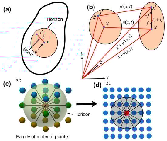 where, , , , and are the displacement, density, body force per unit volume at the material point, the pairwise force acting along the bond between and and the volume of the material point at , respectively. The integral of the forces acting at the parent material point is performed over a finite region , called Horizon in the peridynamic theory. The material points inside a Horizon are called the family members of the parent material point. The parent material point interacts with the other material points within its family while the interactions with the points outside the Horizon are negligible. Figure 1c,d represent a family of a material point in three-dimension and in two-dimension, respectively.