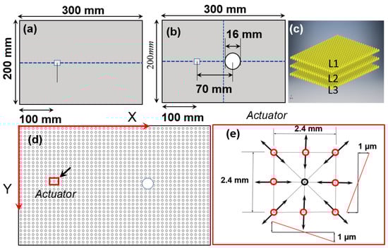 The schematics showing the geometry of an Aluminum 6061-T6 plate used in the simulation: (a) Pristine plate with PZT mounted on the top surface, (b) Plate with a through-thickness hole and a PZT patch, (c) Discretization of the plate and material layers (top, middle and bottom surfaces, L1, L2 and L3, respectively), (d) Schematics of Peri-elastodynamics discretization of the plate showing PZT and the hole (e) Boundary condition: Particle displacement due to the PZT excitation.