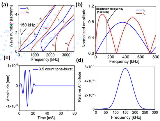 where, , h and are the signal shape factor, the half thickness of the specimen and the number of cycles of the actuation signal, respectively. To select the desired excitation frequency, the tuning curves for S0 and A0 modes in the Aluminum 6061-T6 were obtained from an open source software “Waveform Revealer” [38], developed by the LAMSS laboratory at the University of South Carolina (USC). As shown in Figure 3a,b, the central frequency of 150 kHz is chosen to make sure that only the S0 and A0 modes are excited when the modal amplitudes are comparable but nonequal. In the present study, a 3.5 count tone-burst signal with the central frequency () of 150 kHz is used. Figure 3c,d show the time domain signal and its frequency content, respectively.