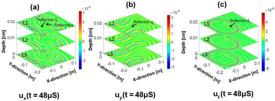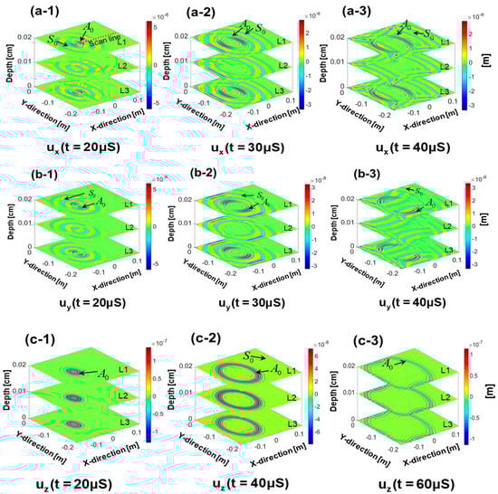 In the top (L1) and the bottom (L3) layers in Figure 4(a-1–a-3) and Figure 4(b-1–b-3), both Symmetric and Antisymmetric modes (S0 and A0) are visible in the wave fields composed of in plane displacements. The contribution of the A0 mode in the in-plane motion at the middle layer (L2) of the plate is negligible but the out of plane motion is dominant. As shown in Figure 4(c-1–c-3), the out of plane displacement of the A0 mode is visible (i.e., contribution from ) while the S0 mode is barely noticeable. This is because the displacements of the in-plane particles of the S0 mode dominates over the out of plane motion of the particles. Also, the contribution of the S0 mode in the displacement of the middle layer (L2) of the plate is negligible, because, in the S0 mode, the middle layer (L2) remains undisturbed.
