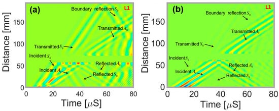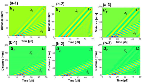 Time-space representation of the in plane () and the out of plane displacement () are presented in Figure 5. Displacements at the top, middle and the bottom surfaces (L1, L2 and L3), are presented to investigate the existence of the different Lamb wave modes and their contribution to the displacement in each layer. In Figure 5(a-1–a-3), it is observed that the S0 mode contributes to the in-plane displacement in all layers and the A0 mode contributes only to the top and the bottom layers. Time-space representation of the out of plane displacement is shown in Figure 5(b-1–b-3), which show that the A0 mode had a higher amplitude than the S0 mode. A0 mode contributed to the displacement of all the layers (L1, L2 and L3), whereas, S0 mode contributed only to the top (L1) and the bottom (L3) layers. Video S1 in the supplementary material shows the guided wave propagation through the displacement of the layer L1 of the pristine state of the plate used in this article.