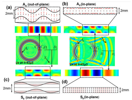 To prove the accuracy of the Peri-elastodynamic simulation, the characteristics of the Lamb wave modes (S0 and A0), in plane and out of plane particle motion across-the-thickness are plotted in Figure 6, after 41 μS. Out of plane () and in plane () displacement distribution of A0 mode are extracted along the cross-sections and , of the plate. Similarly, the out of plane and the in-plane displacement distribution of S0 mode is plotted along the cross-section lines and , respectively. Vector fields and displacement distributions are shown in Figure 6a–d. It is observed in Figure 6a that all particles moved either upwards (+Z) or downwards (−Z) with variable amplitude (like bending motion) due to the generation of the A0 mode. In Figure 6c, the top and the bottom layers are symmetrically displaced with respect to the mid-plane and the displacement of the mid-plane is almost zero due to the generation of the S0 mode. In plane particle motion in A0 and S0 modes are also shown in Figure 6b,d. In Figure 6b, the particles at the top and the bottom layers are moved in the opposite directions along the in-plane direction and the displacement of the mid-plane is zero due to the generation of the A0 mode. In Figure 6c, the particle displacements are constant across the thickness due to the S0 mode. Vector fields and the mode shapes in Figure 6 indicate that the Peri-elastodynamics simulated the Lamb waves accurately.