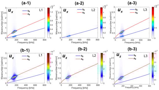 Frequency-wavenumber domain representation of the in-plane displacement () is depicted in Figure 7(a-1–a-3), respectively. Both the S0 and A0 modes are identified at the top and the bottom material layers. This is because they both significantly contributed to the energy of the in-plane wave motion. The amplitudes of the A0 mode are slightly greater than that of the S0 mode. A similar phenomenon is predicted from the tuning curve of the plate at 150 kHz. The contribution of the in-plane motion of the A0 mode to the energy of the middle layer is almost zero. Similarly, Figure 7(b-1–b-3) are obtained from the wavenumber-frequency domain representation of the out of plane () displacements at the top (L1), middle (L2) and the bottom layer (L3), respectively. The energy distribution of the A0 mode is higher than the S0 mode at all the material layers. The S0 mode is visible only at the top and the bottom layers of very low amplitude. This is because the out of plane motion of the particles in S0 mode is very low and the displacement at the midplane is almost zero.