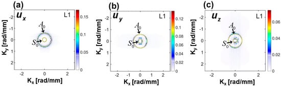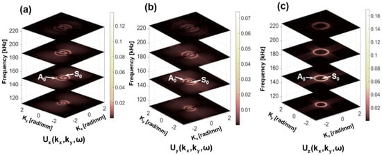 Next, the 3D-FFT is employed to transform the 3D displacement data (, and ) into the frequency-wavenumber domain (, and ) and are shown in Figure 8a–c, respectively. In this work, frequency transformation is performed only on the data obtained from the top surface (L1). The size of the matrix used to store the 3D displacement data was 163 × 250 × 8000. Wavenumber plots at the frequencies 110 kHz, 150 kHz, 185 kHz and 225 kHz, are presented in the Figures. It is seen that both the S0 and the A0 modes appeared in the form of two concentric circular rings. The radius of the circles corresponds to the wave numbers at the respective frequencies. Wavenumbers of the S0 and A0 modes at the 150 kHz are obtained from the Peri-elastodynamic simulation and are 0.56 rad/mm and 0.187 rad/mm, respectively. A smaller circle corresponds to the S0 while the larger corresponds to the A0 mode. It is also observed that the energy of the modes at the frequencies 110 kHz, 185 kHz and 225 kHz are lower compared to that of at the 150 kHz. This is because most of the energy of the modes is concentrated around the excitation frequency (150 kHz).