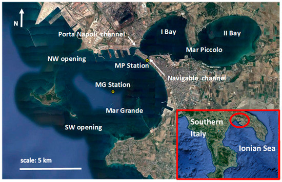 The area in question is in Southern Italy and is composed of two basins—an inner one called Mar Piccolo and an external one named Mar Grande (Figure 1). Mar Piccolo, whose total surface is around 21.7 km2, is formed by two bays, while Mar Grande, with a surface of around 35 km2, has a typical round shape. In the I Bay of Mar Piccolo, the maximum depth is around 15 m, while in the II Bay, it is around 10 m. The I Bay is joined to Mar Grande by means of two channels: an artificial channel (the Navigable Channel), and a natural channel (the Porta Napoli Channel) (Figure 1). The Navigable Channel is 58 m wide, 375 m long and 14 m deep, while the Porta Napoli Channel is 150 m wide and 2.5 m deep. Considering these dimensions and the complex topography, the hydrodynamic patterns in this coastal system can be properly studied only on a local scale. As shown in Figure 1, the Mar Grande is connected to the open sea by means of two openings, located respectively along its Northwestern and Southwestern boundaries.