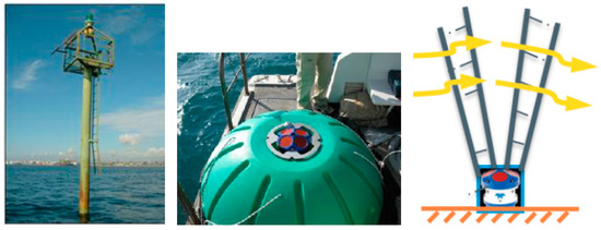 In December 2013, a meteo-oceanographic station (Mar Grande, MG station) was fixed in the Mar Grande basin (Figure 1), at the geographical coordinates, 40°27.6′ N and 17°12.9′ E [20,21]. The local depth in this station is, on average, equal to 23.25 m. In addition to other equipment, a bottom-mounted Acoustic Doppler Current Profiler (ADCP), a multidirectional wave array and a weather station were installed in this station (Figure 2).