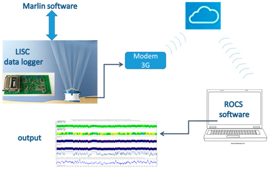 Both stations—MG and MP—work with analogous configurations [13,19]. The sensors are all connected to a datalogger (named LISC), which is an autonomous data acquisition unit, able to acquire data from 12 serial ports and 16 analogic channels. It allows remote control and data download. The data from the ADCPs and the multidirectional wave meters are processed in real time by this datalogger. This operation is heavy in computing terms and requires high-energy consumption. Therefore, it is managed by the software, MARLIN, installed in a proper device, which connects to the LISC at the end of the measurements for a short time window, just necessary to get the measured data and send back the processed data. The communication with remote systems is possible by means of a cellular modem 3G, connected to the datalogger through a serial port and provided with a stack TCP/IP to send data on the web cloud. In this way, remote systems can be reached, and communication from the web to the devices is possible, managed by proper software (named ROCS). This allows to more LISC dataloggers to be called, either automatically or manually, to download acquired data, and to check or change acquisition parameters. The ROCS core is a relational database, containing configurations and data from all of the managed stations. A ROCS module further allows the export of binary raw data to ascii files. The whole system is managed and controlled by the research unit of the LIC (Laboratory of Coastal Engineering) of the Polytechnic University, in Bari. In Figure 3, a sketch of data transmission is plotted as an example.