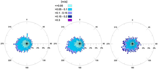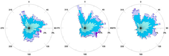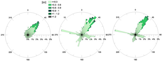 Figure 4 exhibits the annual polar plots of the wind field from the MG station, respectively measured in the years 2014, 2015 and 2016. In all cases, winds from the NNW direction are the most frequent, with maximal intensities generally around 9 m/s. Winds spanning clockwise from NNE to E have moderate velocities (6–9 m/s) and are moderately frequent. Along these directions, both moderate and low winds (3–6 m/s) become more frequent in 2015 and 2016, with respect to the year 2014. The most intense winds are typically Southern and above all, Sirocco winds (i.e., blowing from the SE), with intensities in the range of 12–15 m/s, even if they are less frequent. It is evident that the wind distribution has a recursive annual behavior, thus, each year confirms what was already observed in the previous one, at the same station [13,19]. It is worth noting that winds contributing to wave formation are winds coming from the open sea, namely, those blowing within the limits of the geographical fetch. Due to the geographical position of the station, near the center of the Mar Grande basin (Figure 1), winds spanning from S to NW should be the most effective for wave generation. Nevertheless, the round and confined shape of the Mar Grande basin, whose boundaries are interrupted by two openings—in the NW and SW—induces very limited fetches. Therefore, it can be assumed that wind waves rarely occur in this coastal basin because of short fetches and dominant inland winds. On the contrary, the topography of the basin makes it prevalently dominated by swell waves, generated outside the Mar Grande, which propagate inside it, in particular, passing through the Southwestern opening.