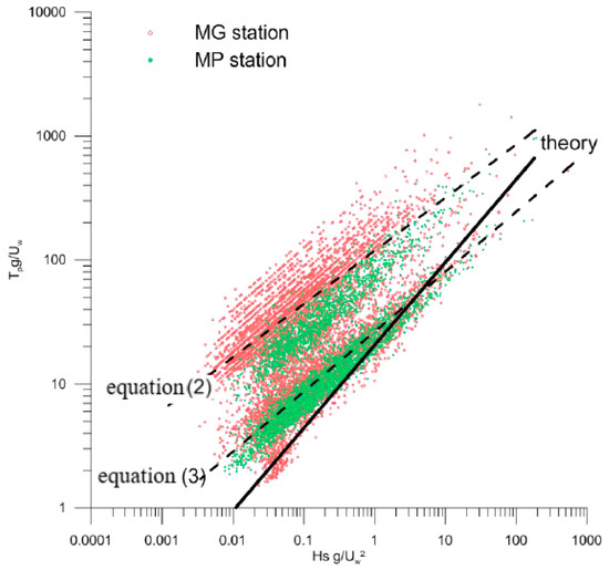 Therefore, the measured Hs and Tp have been normalized, respectively, with g/Uw2 and g/Uw. Their scatter plot is drawn in a log scale, in Figure 6, where all the recorded data are included. It is evident that they tend to collapse in two different lines (dotted lines), far from the fully-developed theoretical wind-sea curve (solid line). The wind-sea condition represents a very small fraction of the total wave regime in the study region—about 6% of the total data. Mostly, wave data generally have Hs/(gTp2) < 0.0025, and are best fitted by the two following relations:
