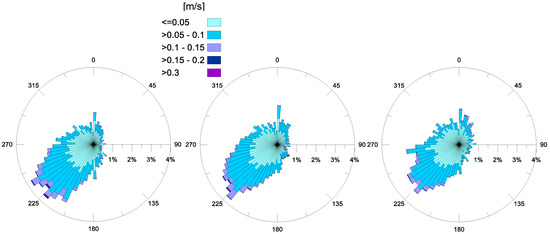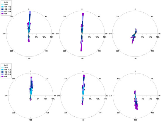 The annual pattern of the surface currents, recorded in 2016, confirms the observations of both years 2014 and 2015 (Figure 7). This highlights that superficial currents predominantly propagate in the second and third quadrant (from north to south), with similar annual frequencies for each year. However, in the year 2016, more intense currents (values 0.1–0.2 m/s) were recorded at the MG station. A comparison of Figure 7 with the annual winds shown in Figure 4, highlights that winds blowing from land do not have a direct effect on the origin of sea waves (Figure 5), rather, they seem to drive surface current, whose direction of propagation is consistent with incoming winds, spanning from NE to SE (Figure 4).