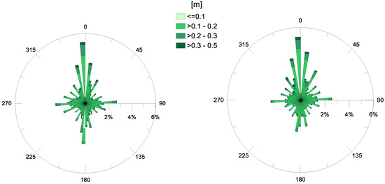 The analysis carried out for the waves and currents at the MG station has also been applied to the data from the MP station, in the Navigable Channel. The polar plots of the annual Hs values are displayed in Figure 9, for years 2015 and 2106. Specifically, Figure 9 highlights that, in both years examined, the most frequently-observed direction of propagation in the channel was north, which is expected to be due to the topography and orientation of the channel itself. In fact, the handmade Navigable Channel has a fairly regular shape, and its longitudinal axis is fairly aligned along the N–S direction (12° clockwise rotated from N, see Figure 1). For this reason, the waves that have already spread through the Mar Grande basin finally enter the channel from the south and propagate inside. The predominant direction of wave propagation is S–N, i.e., confined by the shape of the channel itself. Specifically, the monthly analysis reveals that the direction of significant waves is slightly variable in the months when the heights are generally low, such as June and July. On the contrary, it settles along the longitudinal axis of the Navigable Channel when higher heights are observed (September, October, November).