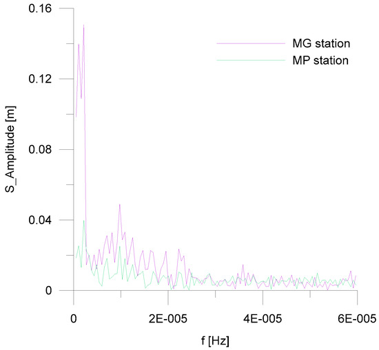 It is worth noting that a correlation of the significant wave heights between the two stations, MG and MP, is always visible, in both the time and frequency domains. The analysis of the time series of the measured Hs highlights that a time lapse of 2 to 3 h occurs between the waves measured at the MG station and the same waves measured at the MP station. The amplitude spectra of the significant wave heights, calculated for each examined month, show the same frequency peaks for the waves at both stations (MG and MP). Furthermore, the amplitudes at corresponding frequencies are higher at the MG station and lower at the MP station. As an example, Figure 10, for the month of November 2015, is shown.