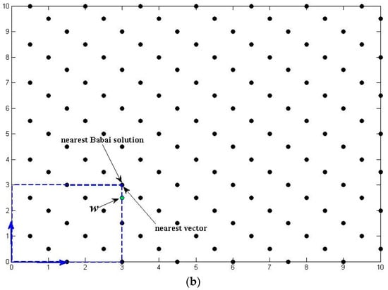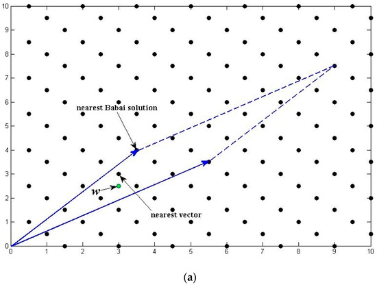 Figure 1 shows the difference between a “bad” and a “good” reduced lattice basis and how they affect the search process. The basis vectors in Figure 1a are relatively long and have smaller angle, which will bring larger error when estimating the CVP solution for real value vector . On the contrary, the basis vectors in Figure 1b are mutually orthogonal, enabling the Babai’s method to find the solution instantly.