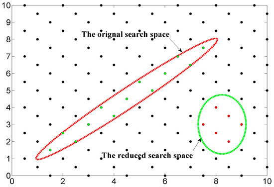 In order to illustrate the influence of condition number on the search time, Figure 2 shows a red ellipsoid defined by the original matrix and a reduced ellipsoid. The initial value for the search is often acquired by using Babai’s method [23]. Supposing that we use the sphere search, then the minimum searching radius is the major axe of the hyper-ellipsoid. Clearly, by reducing it to the green ellipsoid showed in Figure 2, the size of the searching sphere is significantly shrunk down. Therefore, the condition number in some way reflects the search space for sphere searching method, which can be taken as an effective measure of reduction quality.