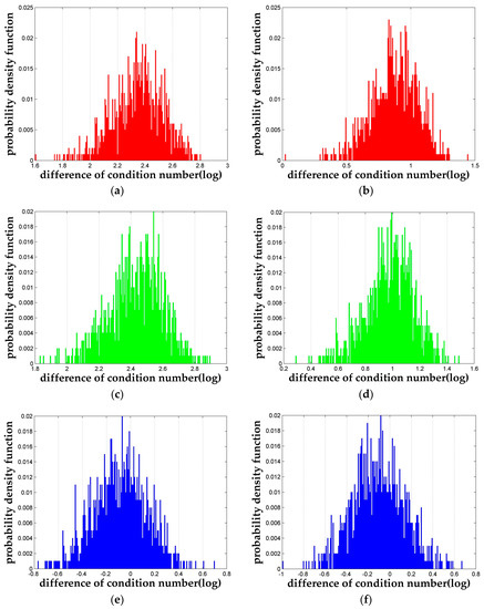 Firstly, we pick out a set of simulations where (for Case 1 only), and and the probability density function of the is plotted in Figure 3. It can be seen clearly in Figure 3a,b () and Figure 3c,d () that both the LLL reduction algorithm and the n-LLL reduction algorithm are able to reduce the condition number significantly. Furthermore, Figure 3e,f shows the difference between the two algorithms , which proves the 4-LLL reduction algorithm has larger probability to perform better than the original LLL reduction. Statistically, among the 1000 independent runs of this particular simulation setting, 64.7% results of the 4-LLL is better than that of the LLL with a maximum improvement factor of 5.85. And the average improvement is about 39%. It should be pointed out that for all the simulation settings mentioned above, the conclusion showed in Figure 3 holds in general.