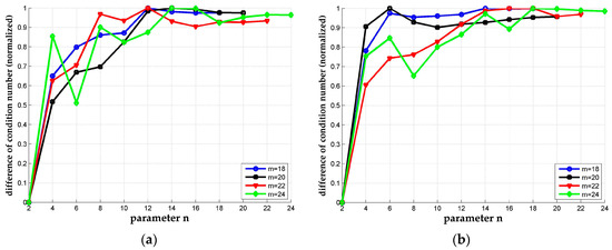 Normalized difference of condition numbers. The differences of condition number between n-LLL and the original LLL are normalized and plotted altogether with m range from 18 to 24. (a) The normalized difference of condition number for κorig = 214 of Case 1; (b) The normalized difference of condition number of Case 2.