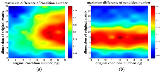 The maximum difference of condition numbers. The max value of the difference of condition number between n-LLL and LLL among all possible n parameter is plotted in the thermodynamic diagram. (a) The maximum difference of condition numbers for Case 1; (b) The maximum difference of condition numbers for Case 2.