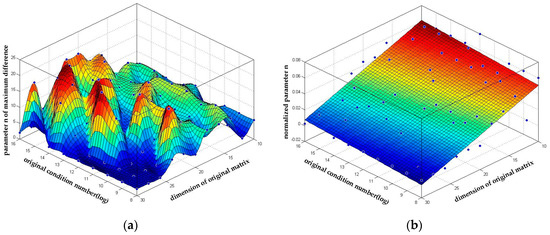 The parameter n with the best reduction quality. The corresponding parameter n of the max difference of condition numbers in Figure 5a. (a) The distribution of parameter n with the best reduction quality; (b) The 1st order fit of normalized parameter n/m2.