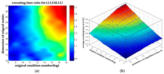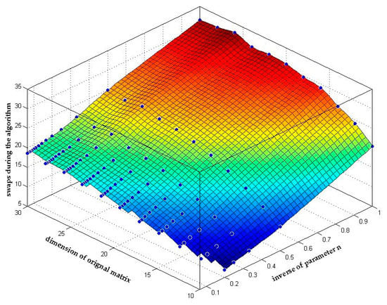 Figure 8 shows the relationship between the matrix dimension, the inverse of parameter n and the average number of swaps in the reduction process. As we analyzed in Section 3.2.2, (39) shows that the number of swaps will actually decline with the increase of parameter n as long as both the dimension and the condition number of the original matrix is determined. And this conclusion can be clearly seen in Figure 8 that the number of swaps declines by n times.