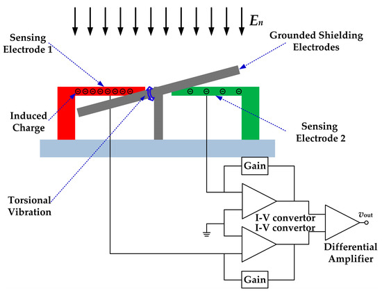 The working principle of the microsensor is shown in Figure 1. Two identical arrays of sensing electrodes are symmetrically located on the substrate, and the grounded shielding electrodes are arranged along their axis of symmetry. The torsional shielding electrodes and the fixed sensing electrodes are fabricated on the same plane and interdigitally arranged. When the microsensor is exposed to a vertical electric field, charge will be induced on these two arrays of sensing electrodes.