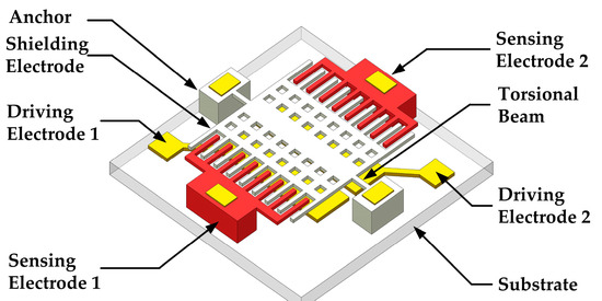 To enlarge the sensor’s response, the sensing electrodes and the shielding electrodes are coplanar and interdigital. In this sensing structure, all the electric field lines terminating on the top surface and the sidewalls of the sensing electrodes can be modulated, leading to the increasement of the effective sensing area. Meanwhile, two arrays of differential sensing electrodes are symmetrically arranged in different sides of the torsional axis to decrease the common-mode noise.