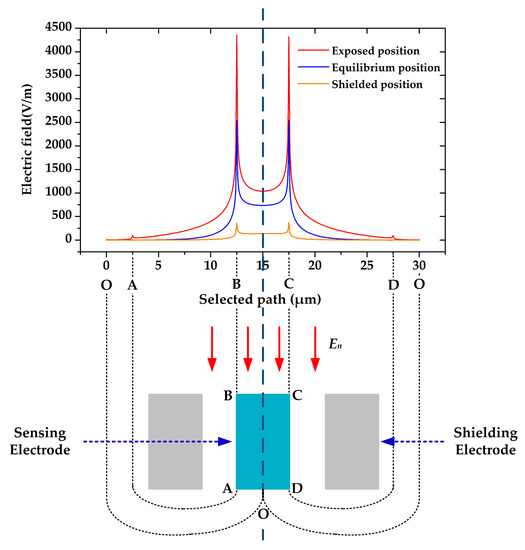 For quantitative comparison, we simulated the electric field distribution on the sensing electrodes by applying an electric field of 1 kV/m. The simulation result is shown in Figure 4, where the clockwise path of the electrodes edge is selected as x axis, and the midpoint O of the bottom line is selected as the start and the end point. According to the simulation result, most components of the electric field terminate on the upside of the sensing electrodes, especially on the top surface. Furthermore, it is illustrated that the out-of-plane shielding method can change the electric field terminating on the sidewalls as well as on the top surface. We calculated the quantity of the induced charge by line integral, and the result shows that