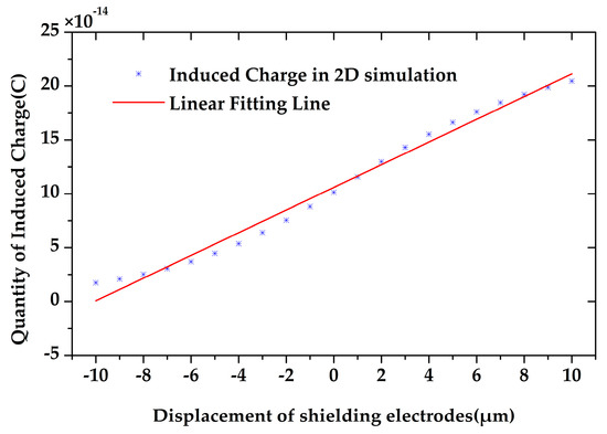 The quantity of the induced charge on the sensing electrodes is highly related to their positions. To observe the induced charge variation during the microsensor’s working time, we simulated the quantity of the induced charge with respect to different displacement of the shielding electrodes from −10 to 10 µm by 2D simulation. As shown in Figure 5, the quantity of the induced charge changes proportionally to the displacement of the shielding electrodes, which means that the output current will also be proportional to the velocity of the shielding electrodes. Meanwhile, the amplitude of the induced current will also be proportional to the maximum displacement of the shielding electrodes.