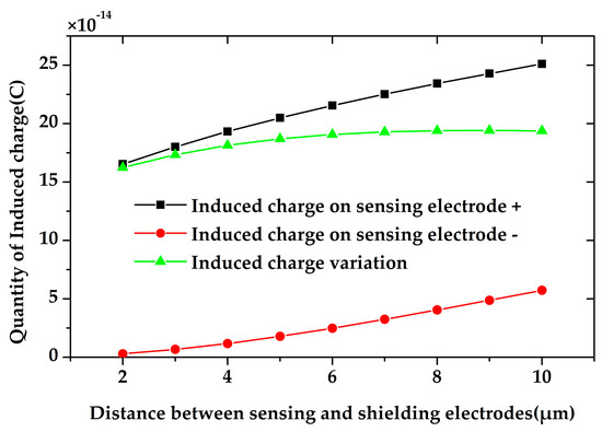 Besides, the distance between the sensing electrodes and the shielding electrodes also has a large impact on the charge induction on the sensing electrodes. The induced charge on the sensing electrodes with respect to different distances between the sensing electrodes and the shielding electrodes was simulated. The result is shown in Figure 6, where the sensing electrode + is exposed and the sensing electrode—is shielded. It shows that, with the increasement of the distance, the induced charge on the two sensing electrodes both increase, and the induced charge variation increases by 25% as the distance changes from 2 µm to 5 µm. However, the induced charge variation will not increase any more when the distance is larger than 5 µm. Therefore, the distance between the sensing electrodes and the shielding electrodes is set to be 5 µm.
