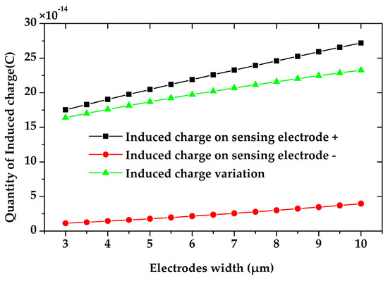 We also simulated the sensing electrodes width’s impact on the charge induction. As shown in Figure 7, the wider the electrodes are, the more charge will be induced on the sensing electrodes. The induced charge variation almost increases linearly to the electrodes width.