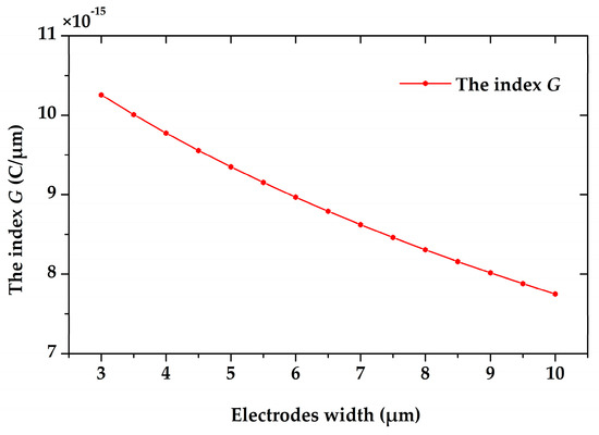 Simulation of the index G versus the electrodes width, as the index G is defined in Formula (4). The narrower the electrodes are, the larger the index G is, as well as the higher the capability is.