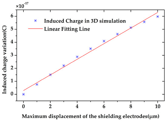 Using the optimal geometrical parameters, the induced charge variation on single sensing electrode of the 3D model was simulated. The simulation result proved that the induced charge variation is proportional to the maximum displacement of the shielding electrodes, as shown in Figure 9. Since the torsional angle is very small, the maximum displacement (the displacement of the shielding electrodes’ end) is proportional to the torsional angle. Therefore, the induced charge variation is proportional to the torsional angle. In addition, the induced charge variation on single electrode is 5.98 × 10−17 C while the maximum displacement of shielding electrodes is 10 µm.