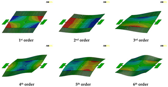 Referring to the realistic working status, the anchors are fixed in all degrees of freedom in the simulation. The first six orders resonant modes were extracted. As shown in Figure 10, the frequencies of the first six orders resonant modes are 5358 Hz, 10,653 Hz, 23,253 Hz, 28,794 Hz, 39,610 Hz and 45,004 Hz, respectively. The torsional resonant mode is the first order among them. The torsional resonant frequency of 5358 Hz is far away from the second order resonant frequency of 10,653 Hz. Thus, the other resonant modes would hardly be excited during the microsensor’s operation, and the interference between the working mode and the other modes will be reduced. Herein, the simulation was conducted without the consideration of the air damping and the negative electrostatic stiffness caused by the dc offset voltage in the actuation.