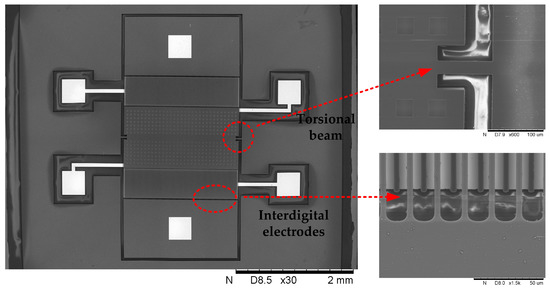 Scanning electron microscope (SEM) photos of the fabricated microsensor are shown in Figure 13. The dimension of the whole EFM is 6 mm × 6 mm. The device is complete and clean, and the key dimension of the structure is in accordance with the design.