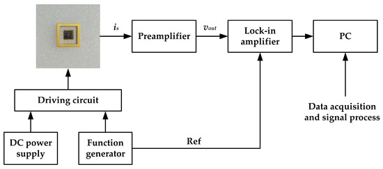 The experiments were conducted using our self-developed calibration system under atmospheric pressure at room temperature. Figure 14 shows the schematic diagram of the calibration system. In the system, a sinusoidal signal was generated by the function generator. Firstly, the dc power supply and function generator were used to drive the microsensor. Then the output currents of the microsensor would be converted into a voltage by the preamplifier with a trans-resistance of 100 MΩ. Finally, a lock-in amplifier was used to extract the amplitude of the output voltage.