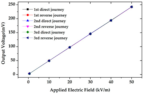 For further characterization, the microsensor was tested in the three roundtrip measurements under an electrostatic field range of 0–50 kV/m, and the experimental result is shown in Figure 17. The uncertainty of the EFM was calculated to be 0.38%, which indicated that the microsensor has very high precision for electrostatic field measurement.