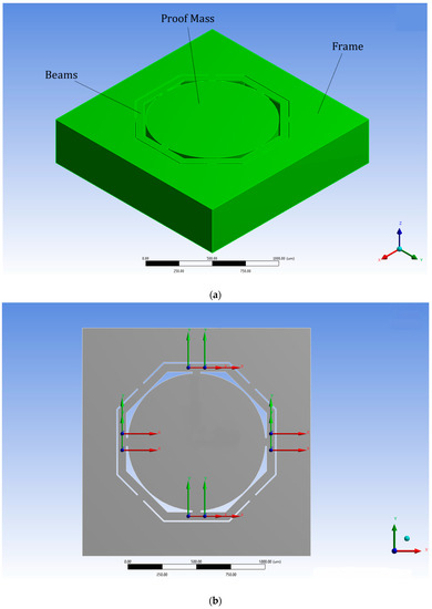 The section describes the design, modelling, and optimization of a triaxial single square millimeter bio-mechanic piezoresistive accelerometer available from the literature as state-of-art device [20,23] and presents mass moment of inertia results. This chosen device as starting point of the optimization process is a triaxial accelerometer with one single mass available for all axes of measurement and it is characterized by a cylindrical proof-mass suspended by four octagonal beams fixed to an external frame (Figure 1a isometric view and Figure 1b top view) [20,23]. As accurate measuring of head accelerations is an important aspect in predicting head injury, it is important that the measuring sensor be well-coupled to the head [17]. Therefore, the main requirements of this application are miniaturization (≈1.5 × 1.5 mm2) and medium-G measurement range (<500 G) to allow the accelerometer incorporation into an earpiece. Bandwidth specification of the device is not relevant in this study as it can be adjusted by changing the device size accordingly. Typically, the frequency response of a miniature device like the one under study is of 1 kHz, a smaller device will determine a higher bandwidth of frequency. In reality for the particular application under study where high speed impacts are common, long duration transience is usually measured, therefore very low signal frequencies are expected in the order of 0–0.5 Hz. These low frequencies responses down to DC (i.e., they respond to steady-state accelerations) are specifically detected using a piezoresistor pick-off technology. At frequencies close to 0 Hz, piezoelectric accelerometers cannot, when high accuracy is required, measure the acceleration that an object is subject to [39].