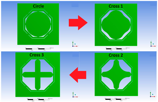 The state-of-art sensor has been obtained from different optimization method based on MMI change as well [20,23]. In this study, the MMI will be increased progressively from a circular proof-mass design (Figure 1) to a cross design, that, at each of the three iteration of optimization, increases the angle of curvature of the proof-mass corners, until it becomes a complete cross as shown in Figure 2. The proof-mass design change from Circle to Cross 1 (top-right in Figure 2), and then to Cross 2 (bottom-right) and finally to Cross 3 (bottom-left).