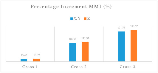 Sensitivity increment of new designs in percentage. Highest increment is for the z-axis sensitivity of design Cross 3 (≈80%), overall the sensitivity increases progressively from design Cross 1 to Cross 3, demonstrating the effect of MMI.