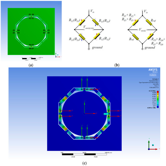 Measurement circuit design: (a) Piezoresistors location on the top surface of the device. A total of 16 piezoresistors are used, 4 for the x-axis, 4 for the y-axis, and 8 for the z-axis; (b) Ax-, Ay-, and Az-Wheatstone Bridge measurement circuit; (c) Stress distribution under x-axis acceleration. Piezoresistors are placed where the highest stress is located by the finite element stress distribution analysis in order to maximize sensor sensitivity (see axial coordinates). Notice that in the oblique directions on the beams, where there is a clear high stress distribution (in red), the piezoresistors cannot be placed as in these directions they do not show high piezoresistance effect.
